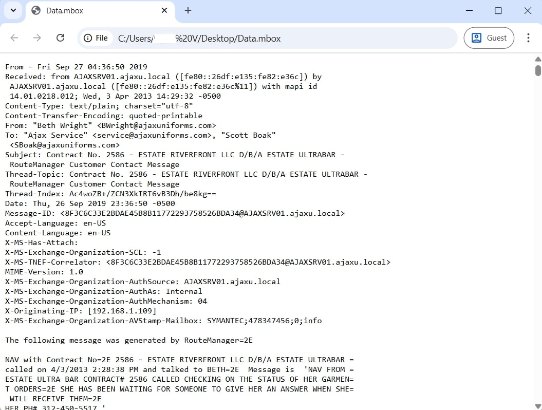 Tried to open MBOX file in Chrome, only to find the displayed content incomprehensible. Do not worry, Chrome shows the content in the file as it should be. The MBOX files are primarily read as a Text file by Google Chrome; therefore, it is displayed in such a raw form. Check out the screenshot below.